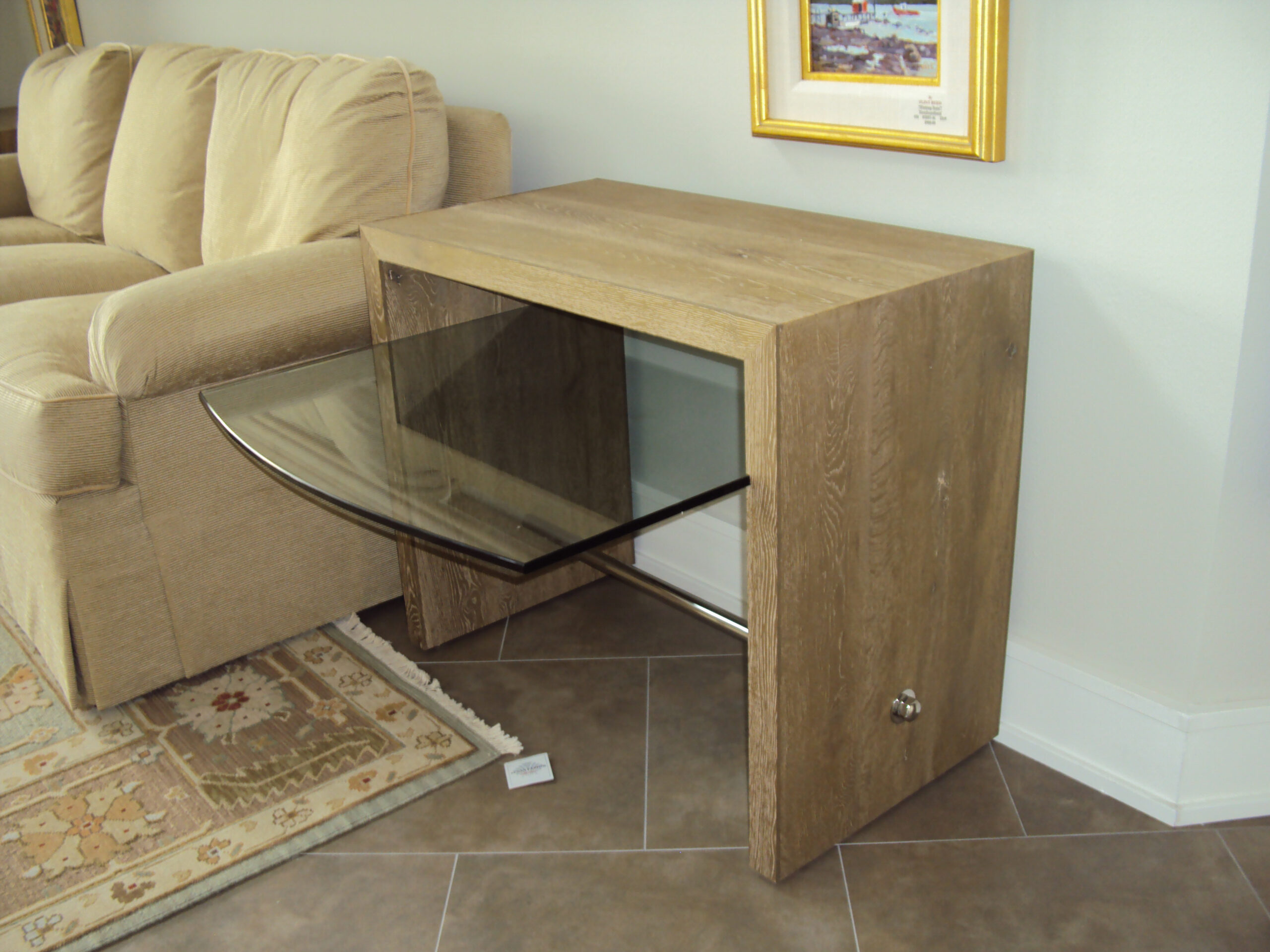 SCC Tbl, Oak Wd. w/Glass Shelf/Stain. Stl. Stretcher, 33″x33″x33″ #BHCC/26